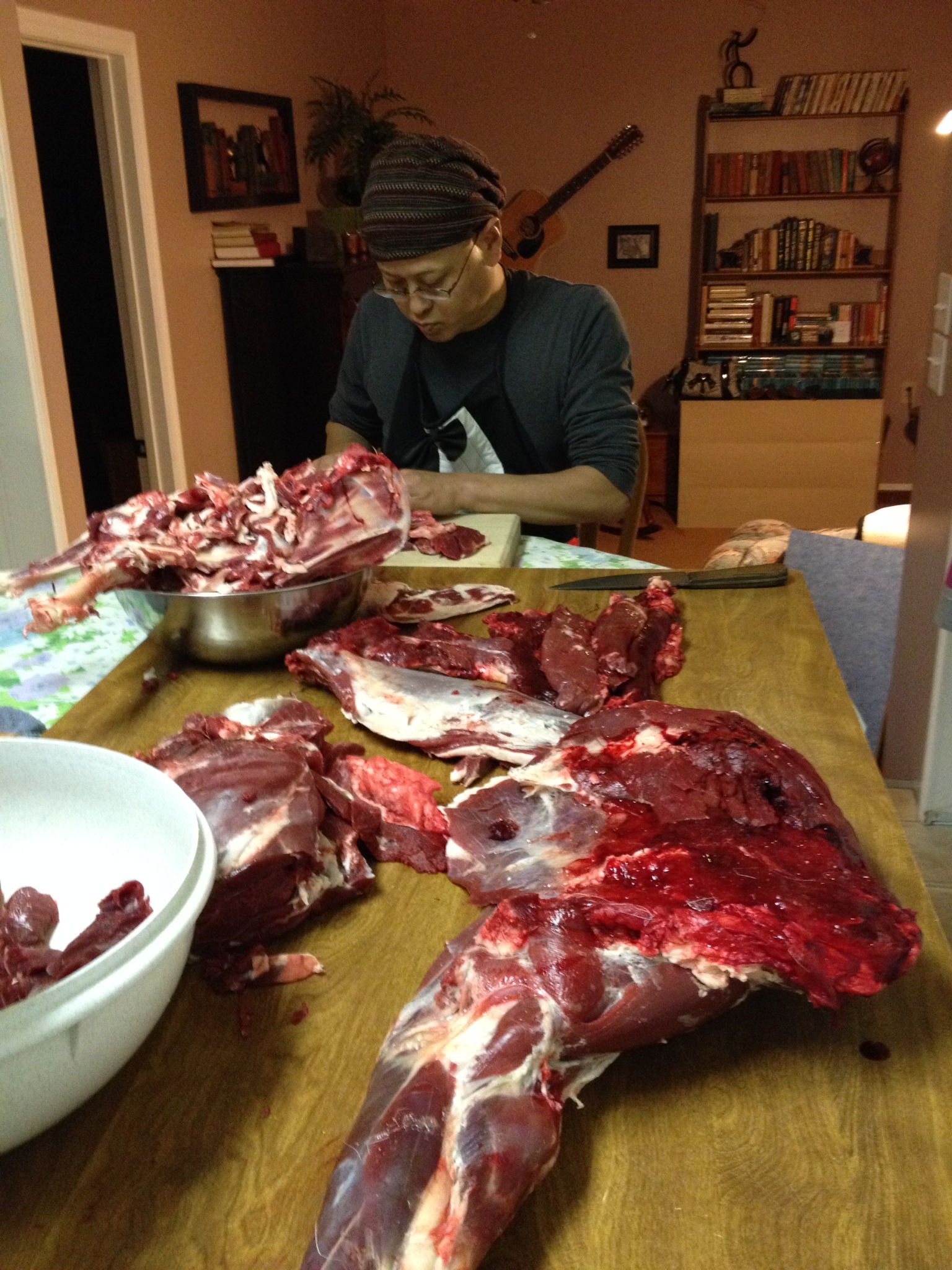 19:30、マシューの家でハンティングで仕留めたシカ2頭を捌く会。テーブルには皮を剥いだばかりの肉塊が置いてありますがとりあえずは食事です。肉塊を前にして食べるトルティーヤとレモネードジュース。一旦、作業が始まると手が離せないのですが、それでもかまわずシカのステーキをほおばりながら、コーヒーを飲みながら、ひたすらに肉を捌きます。グラント、リン、ティルザ、マシュー、サムエルに助っ人が加わり、ジェフリー、もう一人のマシューと総勢8人がかりで捌いたのは、ステーキ肉以外にミンチ肉約150~200gが70パックといったところか。全部は出来なかったのですが残りは次の機会にという事で22:30に終了。マシューの書斎にある貴重な本と資料を数冊もらい感激。23:30にコルソン宅に帰ってきました。翌1:00就寝。